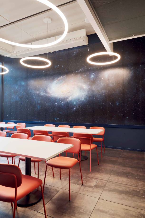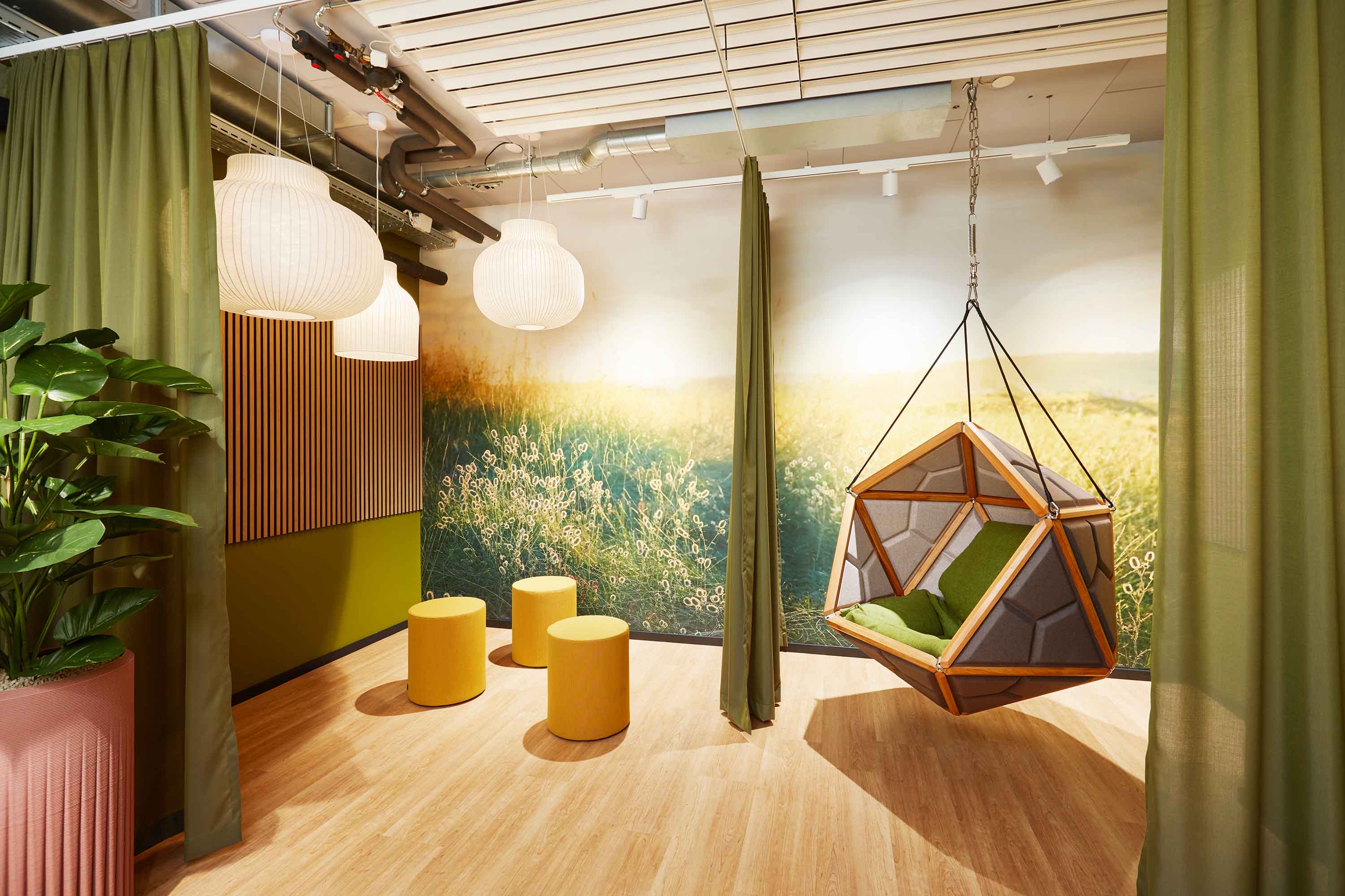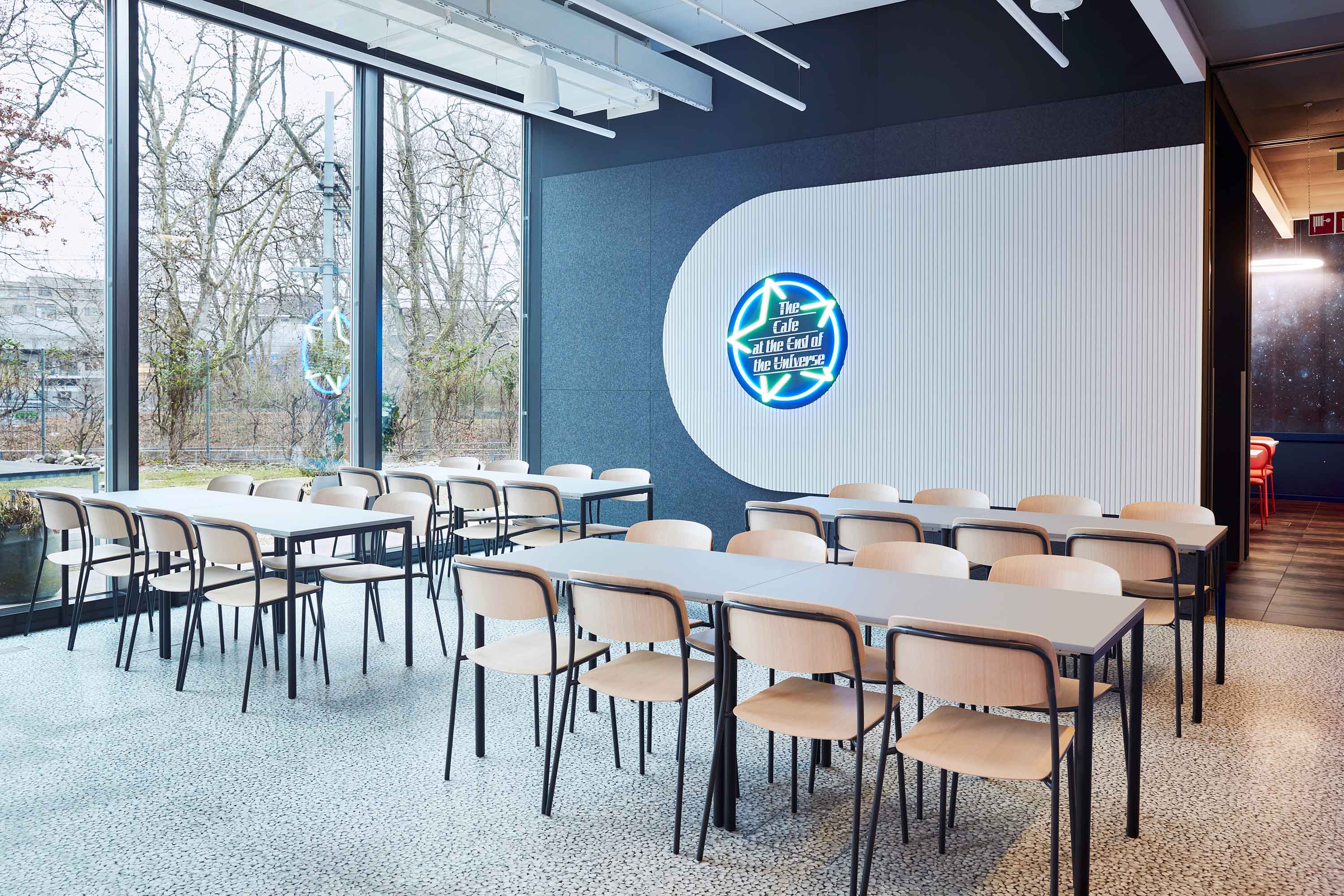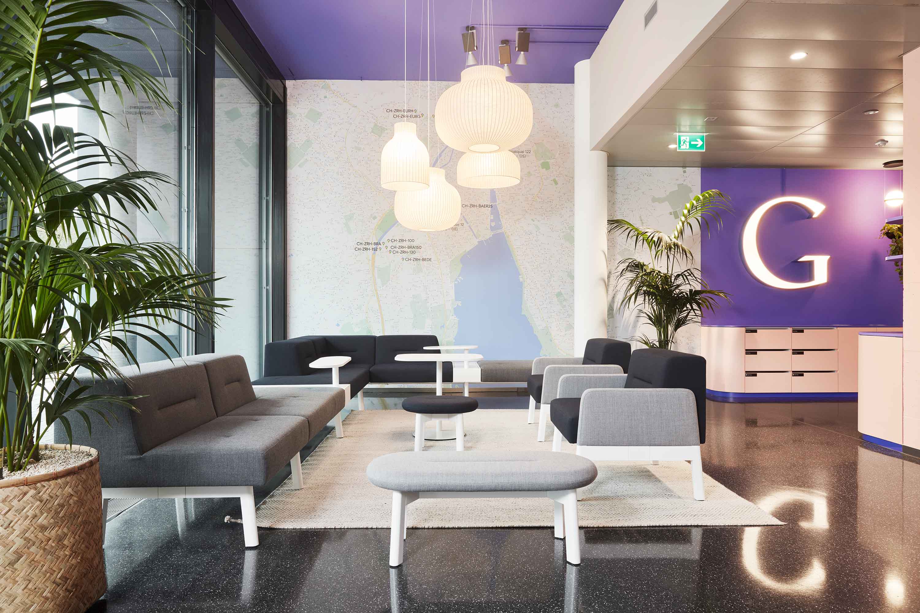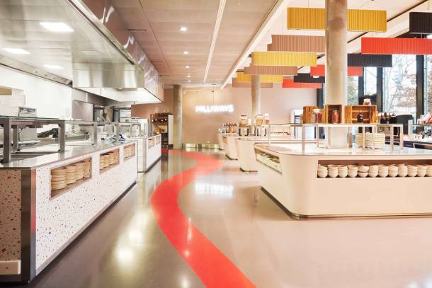 Die Neukonzeption der Cafeteria sah eine Verdoppelung der Nutzfläche sowie ein grosses Angebot an unterschiedlichen Sitzgelegenheiten vor. Weiter wurde das Look’n’Feel auf die überarbeiteten Branding-Guidelines angepasst. Je nach Raumkonzept wurde die Atmosphäre mithilfe von Farben, Materialien und Mobiliar individualisiert. Schlussendlich wurde dem Kunden eine farblich harmonische und akustisch perfekt abgestimmte Arbeitswelt übergeben.