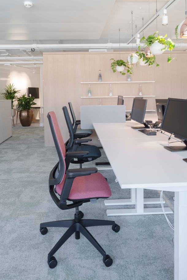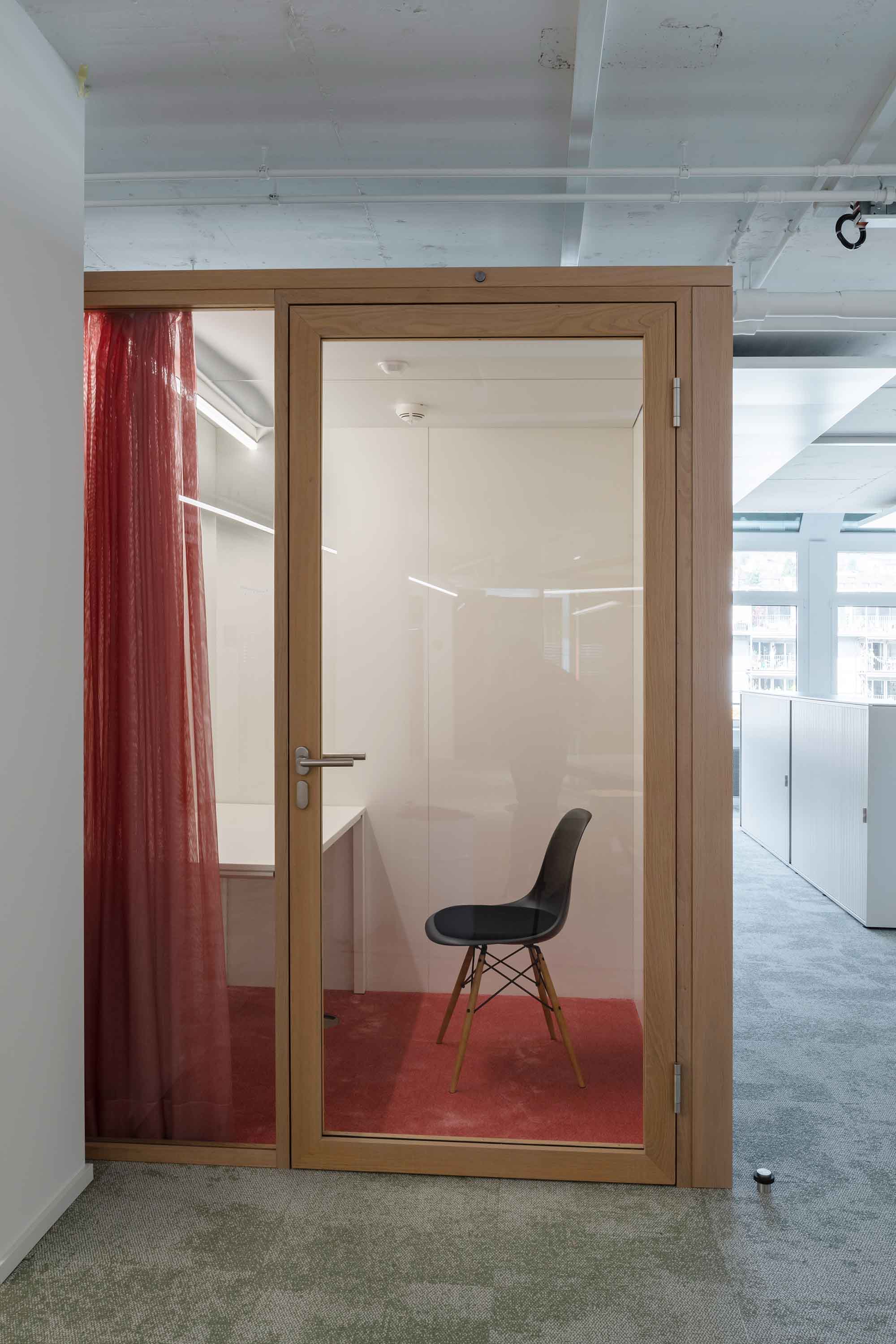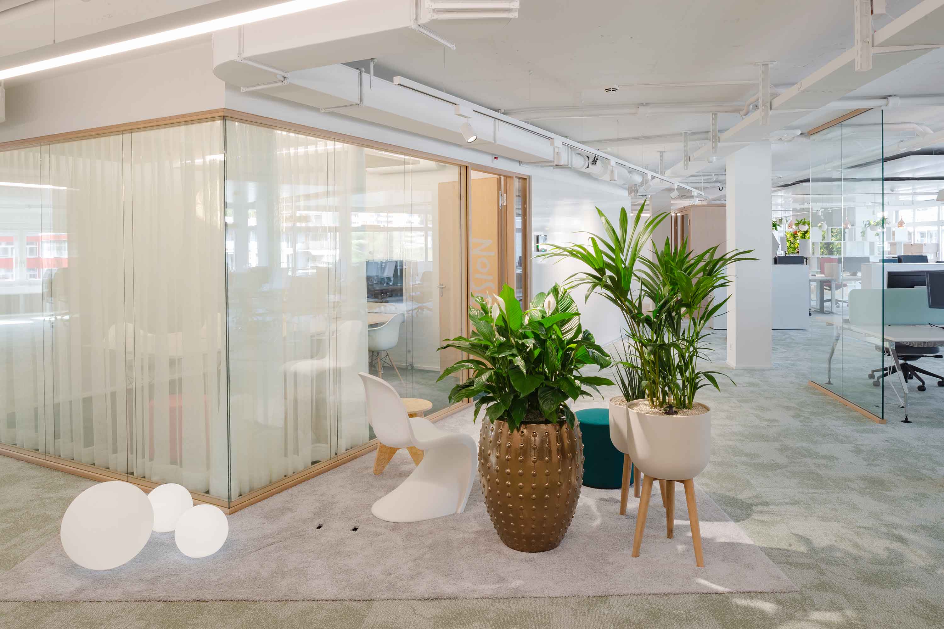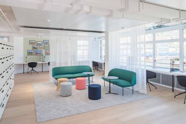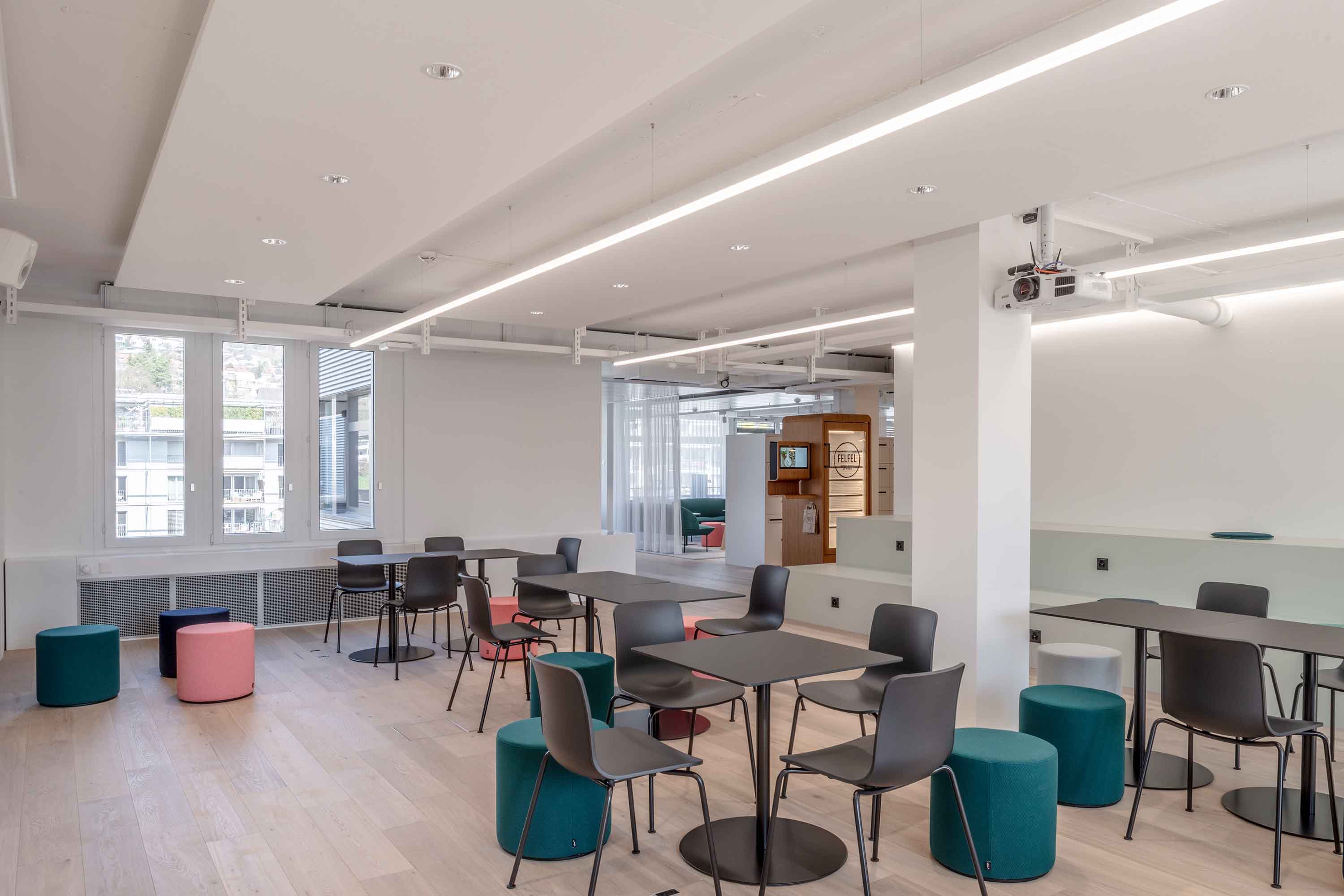 Auf über 1300 m² Bürofläche stehen 80 flexibel nutzbare Arbeitsplätze sowie ein grosses Angebot an Kollaborationsflächen für unterschiedlichste Tätigkeiten zur Verfügung. Neben der Büroeinrichtung entschied sich die Danone AG für Sichtschutz- und Akustikmassnahmen von Trispace.