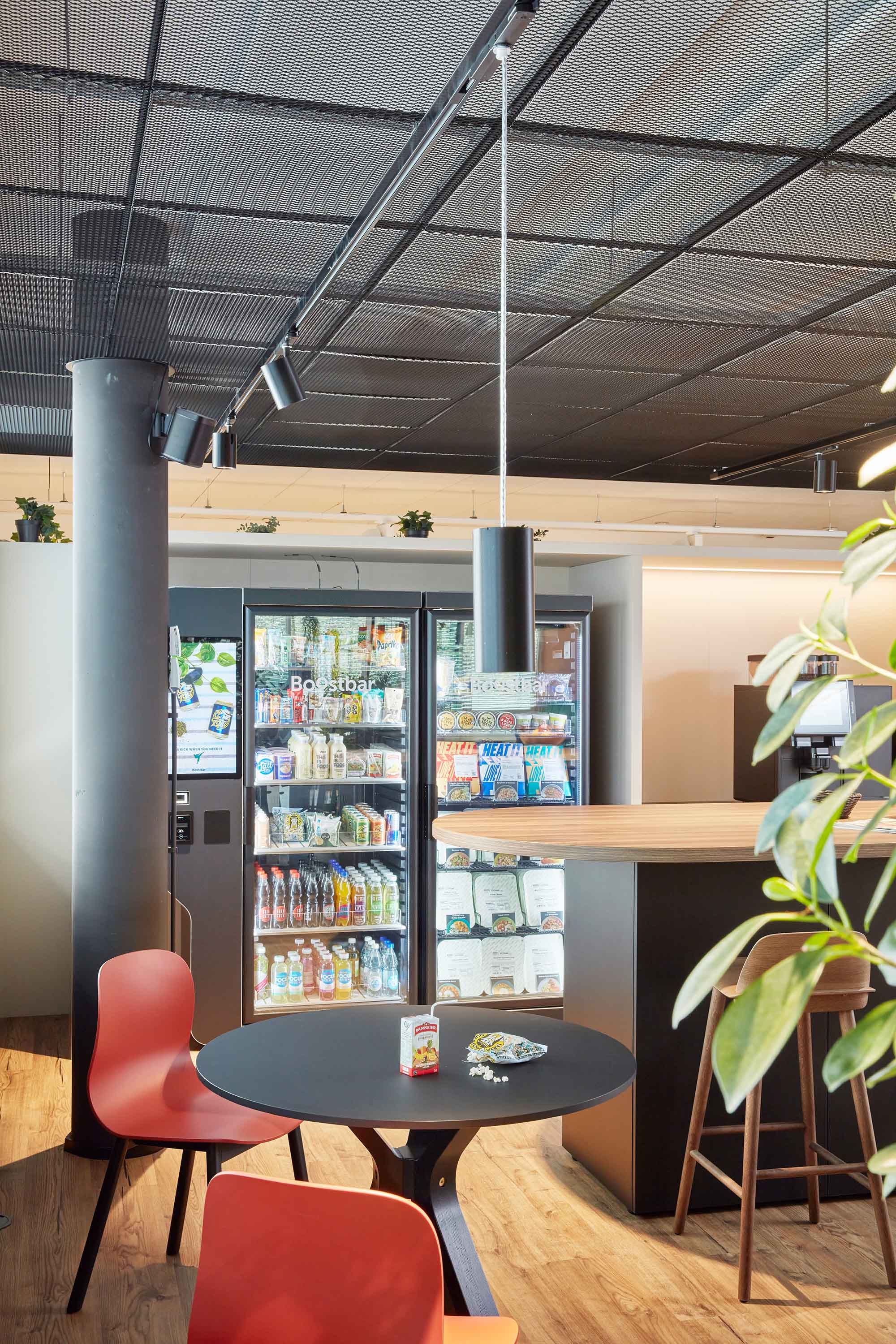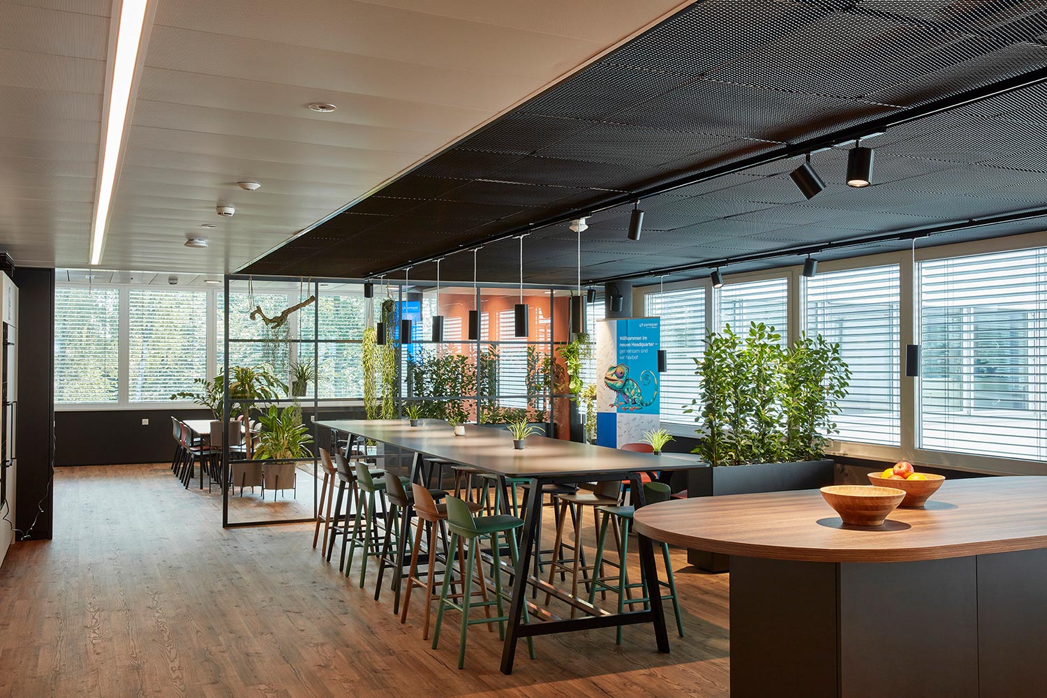 Die grosszügig ausgelegte Cafeteria wurde als Workcafé geplant und bietet neben Café, Kochgelegenheiten und unterschiedlichen Sitzpositionen auch Raum für informelle Meetings.