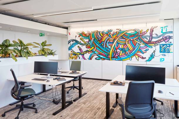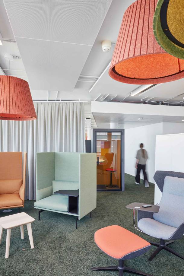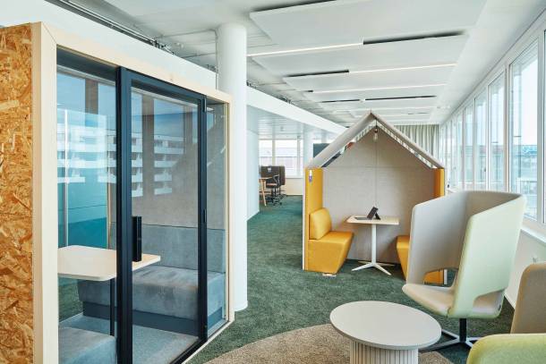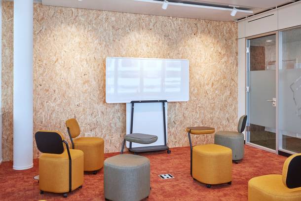 Entstanden ist eine moderne Arbeitswelt, die Platz für bis zu 70 Mitarbeitende bietet. Das hybride Bürokonzept setzt auf fixe und geteilte Arbeitsplätze sowie auf eine Vielzahl an Möglichkeiten für Rückzug und Kollaboration.